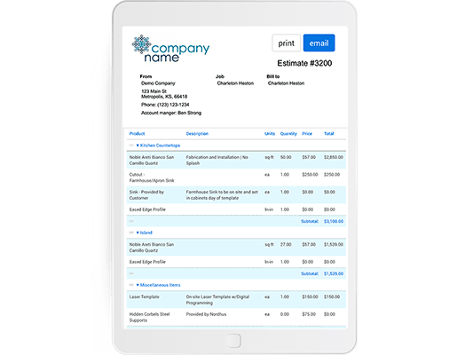 Quickly calculate the square footage of a job and attach job drawings to an estimate. Layout pieces on a slab with images and convert drawings to estimates.
